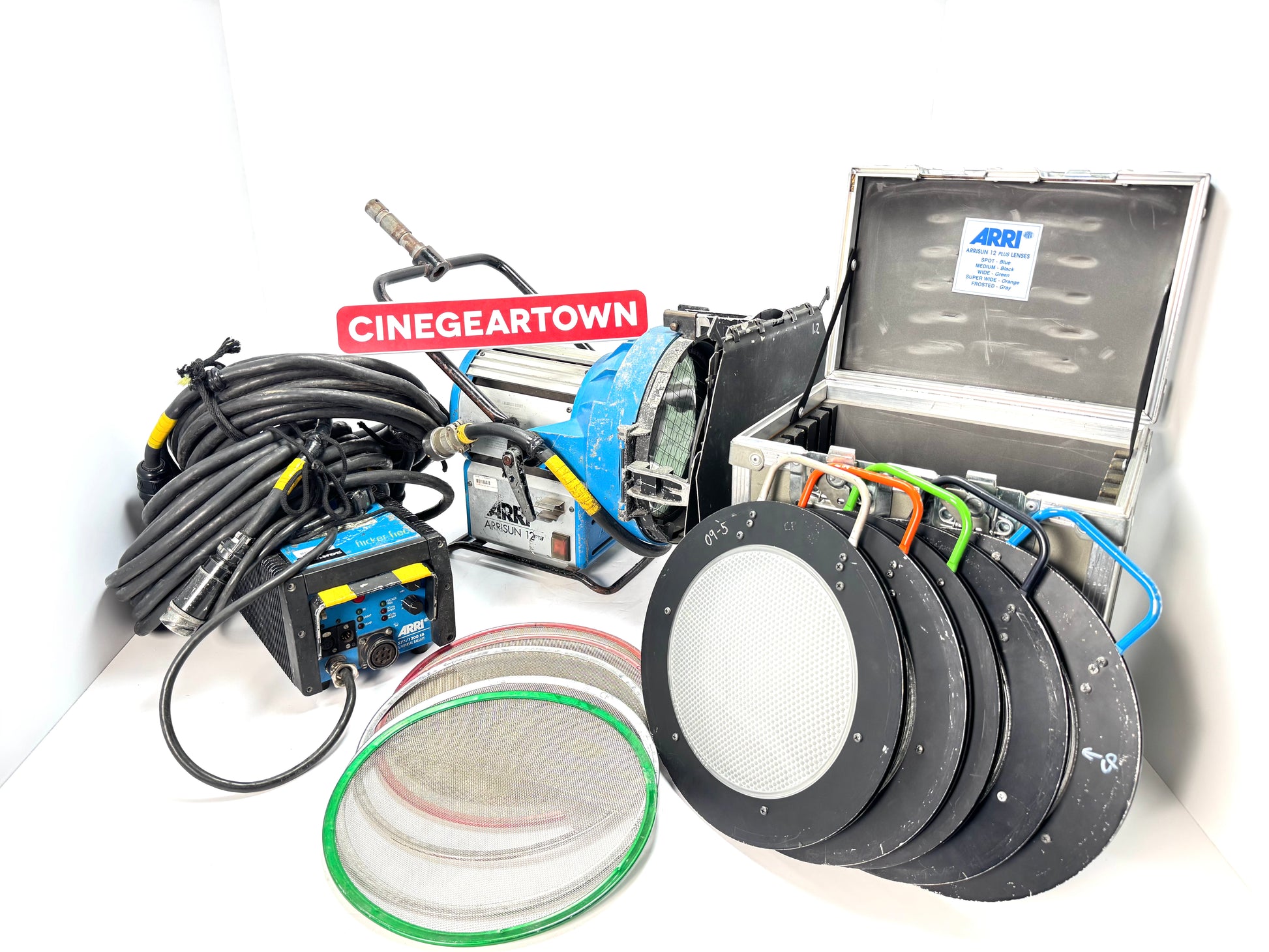 Complete 1.2K HMI lighting kit by ARRI, designed for high-output professional lighting in film and studio environments. Includes ballast, lens set, scrims, and essential cabling.